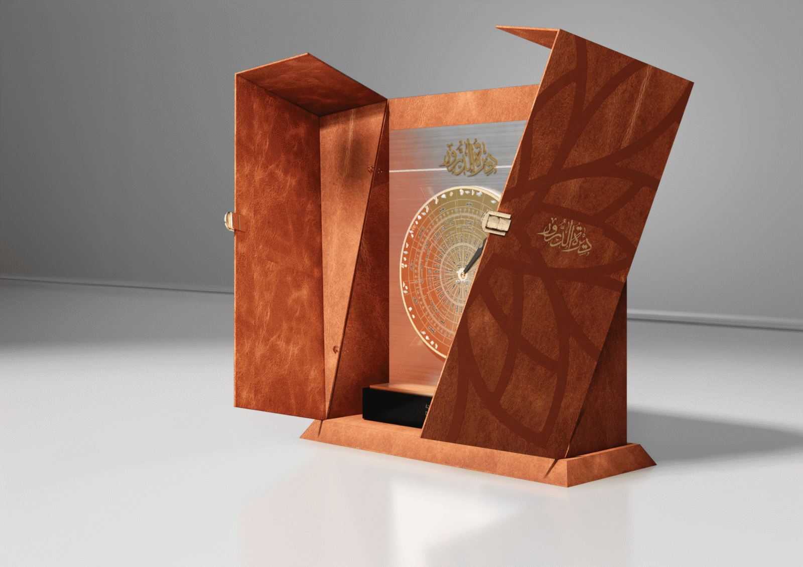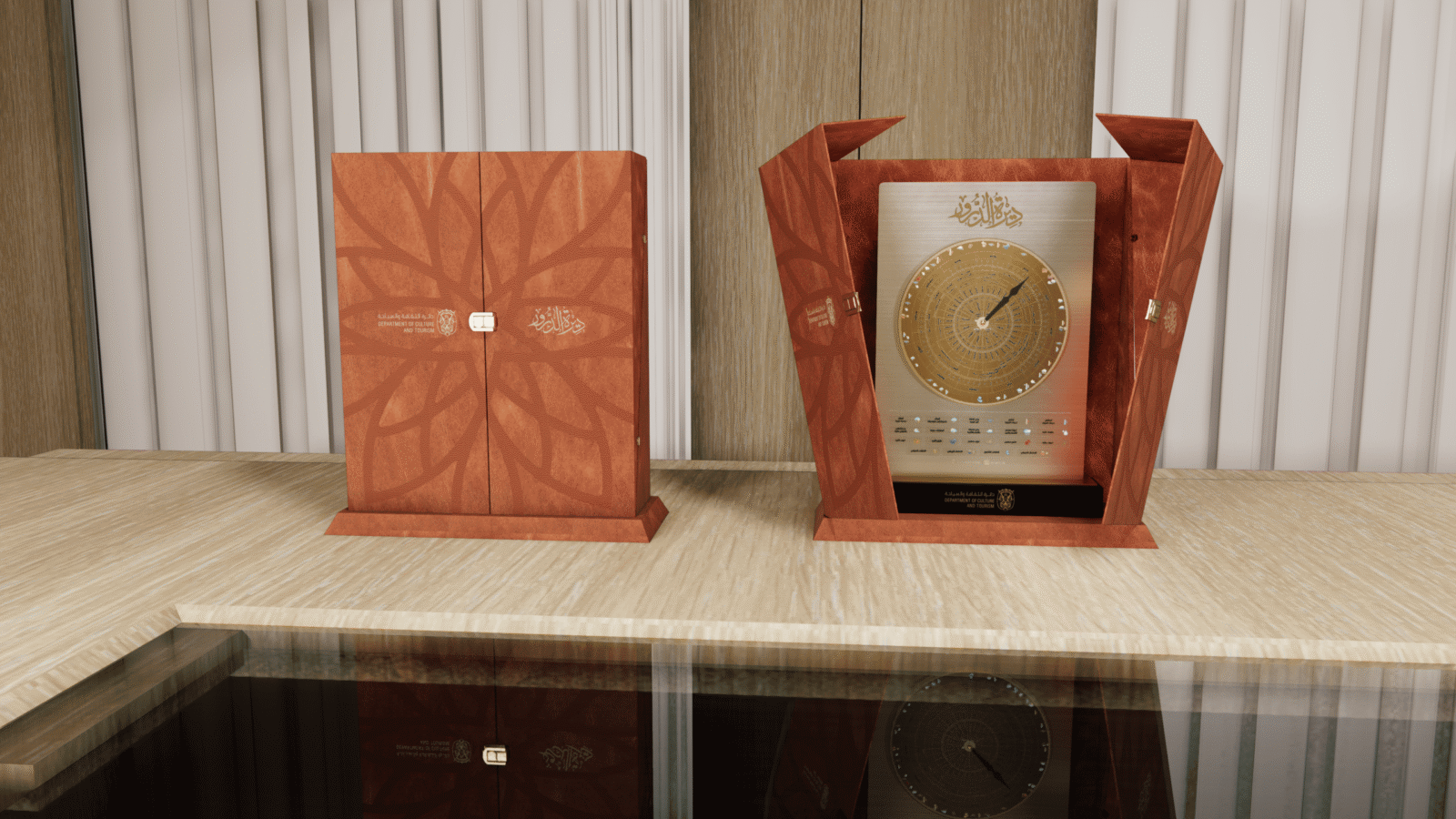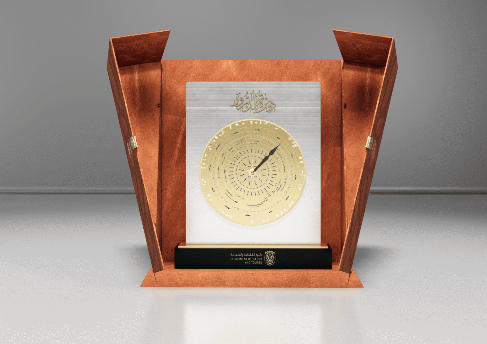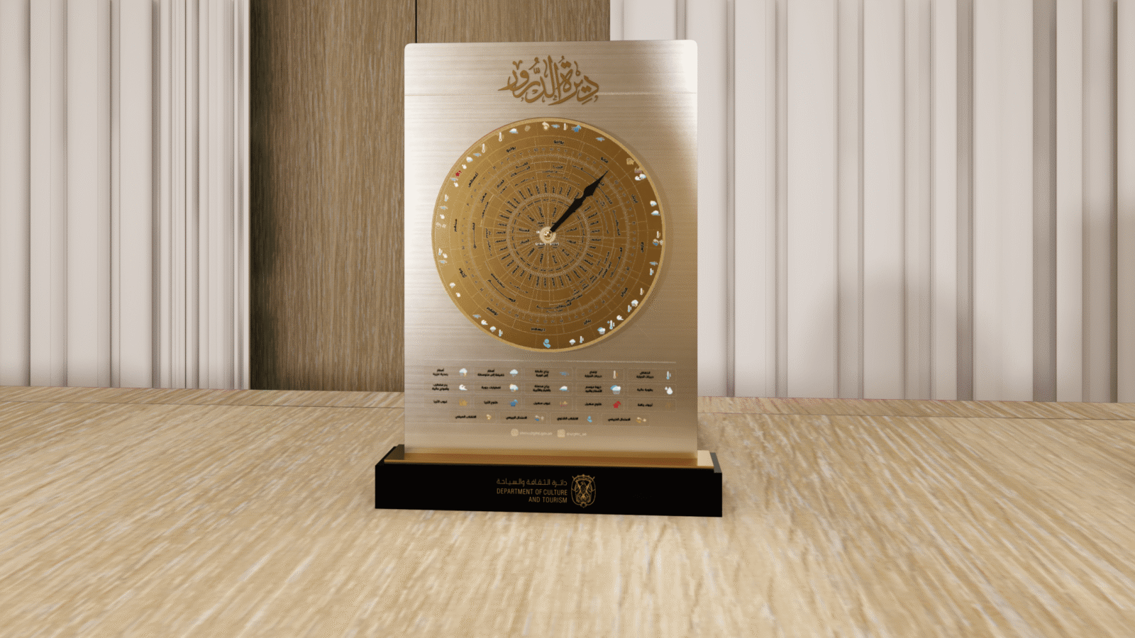 The concept is inspired by traditional Islamic geometric art, symbolizing harmony, knowledge, and timeless cultural identity. Every element—from the rotating dial to the engraved calligraphy—was created to reflect the department’s role in preserving culture and celebrating excellence.